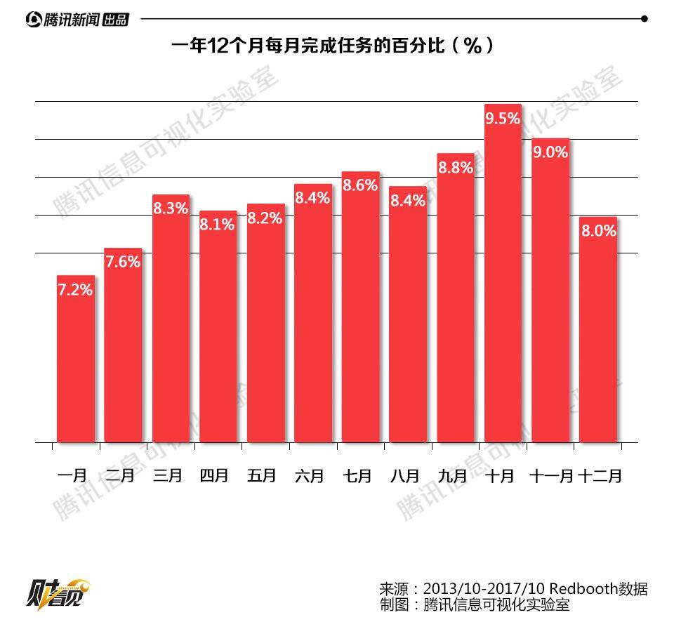 如上圖所示,人們在一年之內的後幾個月完成的工作任務是最多的。比如9月份(8.8%)、10月份(9.5%)、11月份(9%)。在一月份我們只完成了一年工作任務的7.2%,與10月份相比低了25%左右。