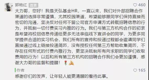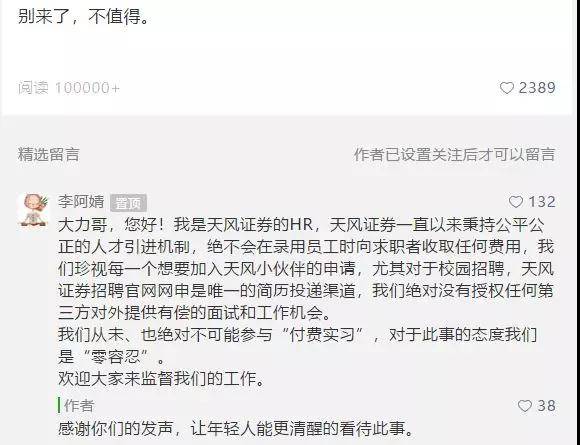 多家券商投行的HR在“大力如山”相關文章下方評論區進行回應,表示反對付費實習內推。