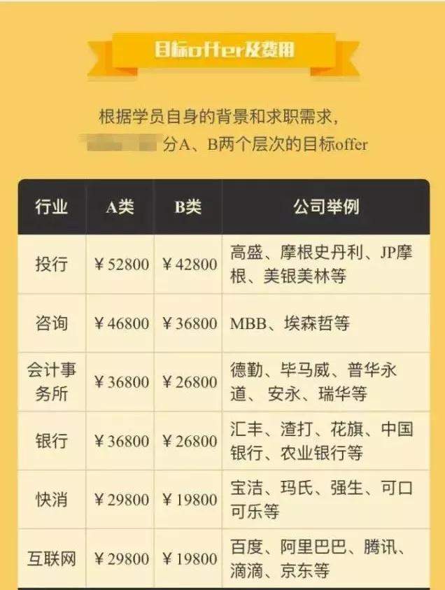 以一向高學歷高含金量的投行和諮詢公司為例,最貴的外資投行如高盛、摩根史丹利、JP摩根、美銀美林等,一份實習offer標價在52800元,而如麥肯錫、貝恩、波士頓諮詢等外資諮詢公司,實習offer標價在46800元。在該項目表中,最便宜的則是國內的快消品和互聯網企業,標價為19800~26800元不等。