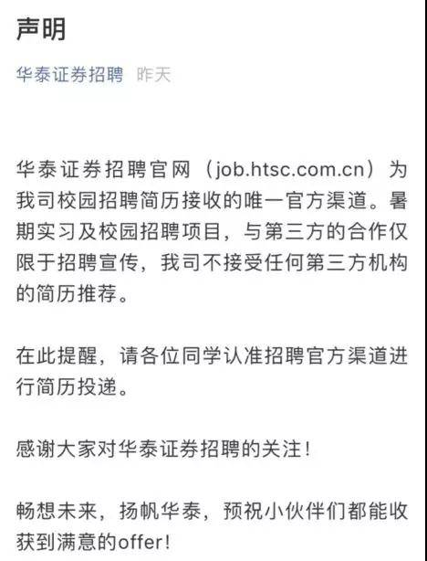 5月28日,微信號“華泰證券招聘”表示,暑期實習及校園招聘項目,與第三方的合作僅限於招聘宣傳,不接受任何第三方機構的簡歷推薦。