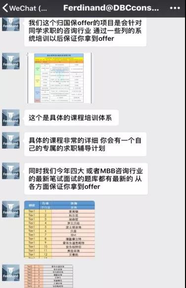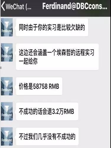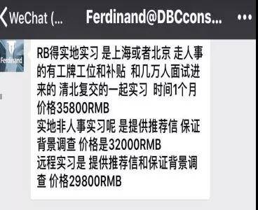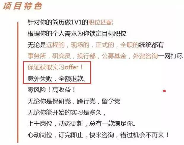 另據券商中國報道,一位正在求職的金融專業應屆畢業生還舉例稱,一個針對金融類海外留學生找金融相關工作的微信號向學生保證,通過一系列培訓後可以拿到一些公司的offer,費用高達五萬多元人民幣。