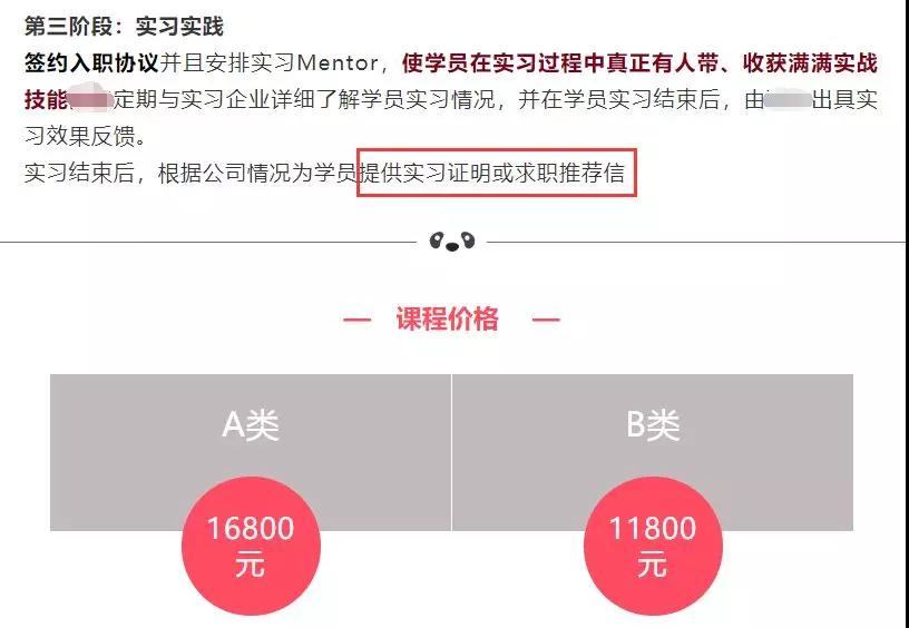 每經小編(微信號:nbdnews)注意到,網上打着“保證拿到offer”“有XX企業內推資源”“實習保offer”等宣傳口號,通過培訓和擔保實習機會收費的宣傳並不少,而課程費用可謂不低。