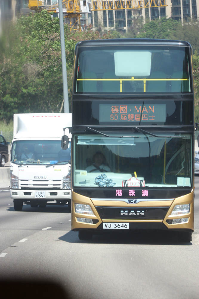 大公報記者昨日下午二時許,在屯門公路往屯門方向的大欖路段,目擊港珠澳大橋穿梭巴士「真身」,相信其當時正在試車。該雙層巴士沿慢線行駛,車頭位置擺放白底紅字的「T牌」,即「試車牌照」。巴士由一名男司機駕駛,車上未見載有其他人。