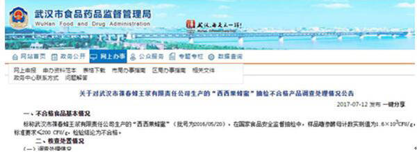 附件三:《關於對武漢市葆春蜂王漿有限責任公司生產的“西西果蜂蜜”抽檢不合格產品調查處理情況公告》