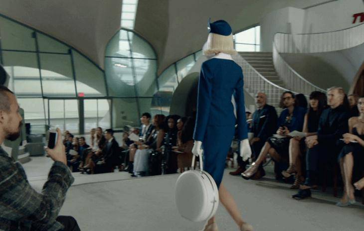 這意味着愛德華茲需要自己設計整場秀的50件造型。“我們不能讓一個設計師説出‘這不是一場好秀’。”為了和這個吸睛的場地搭配,愛德華茲設計了一場50年代末60年代初的噴氣式美學空姐制服。