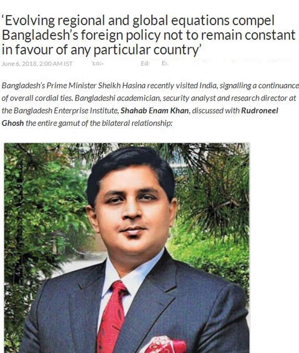 湊巧的是,今天去印度逛網,無意中從一名印度記者的專欄文章《不斷演變的地區和全球關係迫使孟加拉國的外交政策不再一成不變地過度依賴任何特定國家》中,看見了他採訪孟加拉國院士、安全分析師、國企業研究所主任沙哈布·納姆·汗時,所提問的一些關於孟中關係的問題。