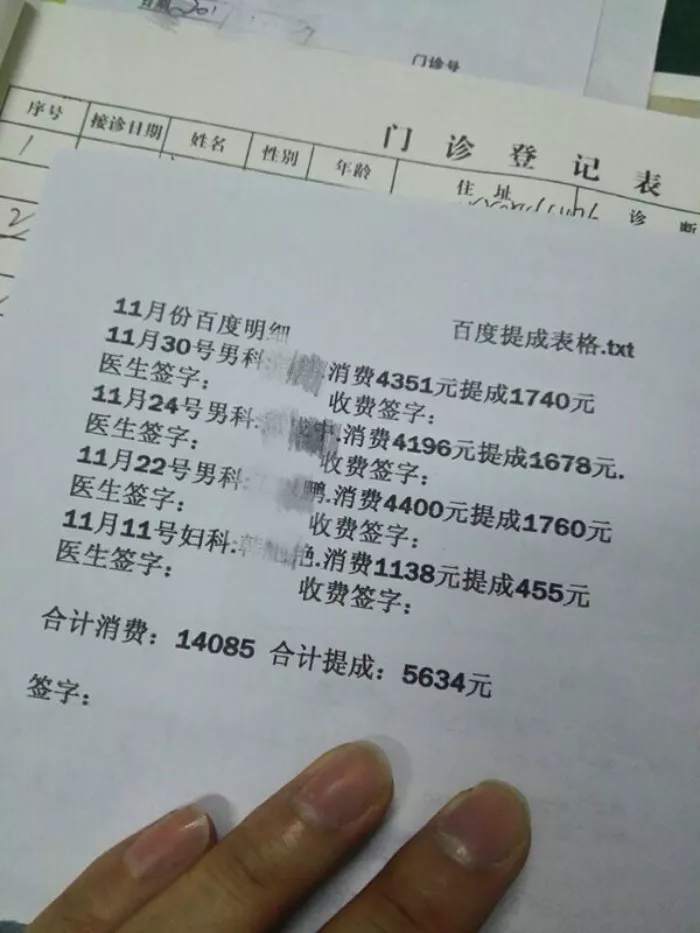 一張“百×提成表格”圖內容為“11月份百×明細”,具體有“11月30日男科某某患者消費4351元提成1740元,醫生簽字、收費簽字……”