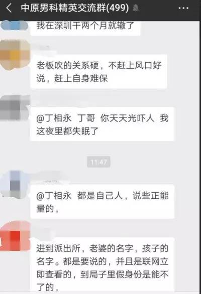 一個擁有499名成員的“中原男科精英交流羣”聊天截圖顯示,有人説:“老闆吹得關係硬,不趕上風口好説,趕上自身難保。”另一人接話説:“你天天光嚇人,我這夜裏都失眠了。”有人説:“套證的如果跑了,就沒事。”另一人説:“對,假名可以,真名的話,傳喚不到會通緝的。”還有人説:“過完這段,繼續努力。”另一人説:“就怕像查環保一樣,人家給我們打持久戰。”