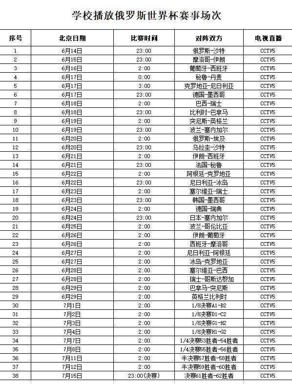 (一)學校將從6月14日開始,在經世樓G103(G102備用)多媒體教室播放當日22:30至次日早上8:00的賽事(學校播放“俄羅斯世界盃”賽事場次見附件)。教室22:20開放,賽事結束後教室關閉,學生須回寢休息。