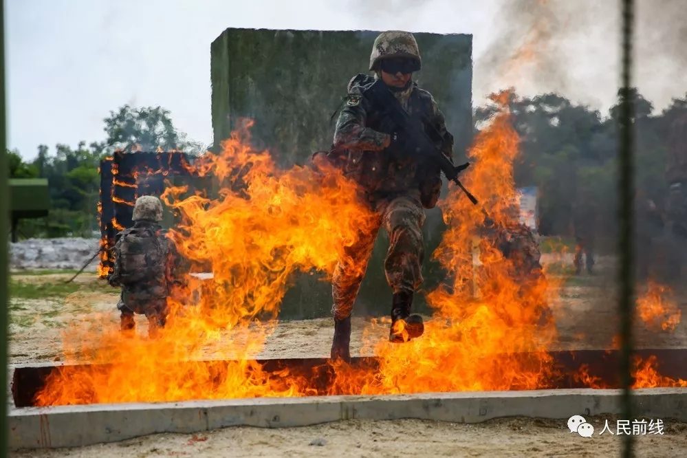 官兵要在戰術背景下依次通過被大火包圍的障礙。