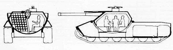 從示意圖可以看到,“三軸試驗平台”的炮塔實際上下半部就是個球,105毫米火炮固定安裝在“球”上,旁邊還有一門同樣固定安裝的30毫米副炮。而“球”裏面,除了有兩個乘員的空間,其“左半球”裏面塞滿了炮彈,而“球”的頂上,則是火控觀瞄系統。