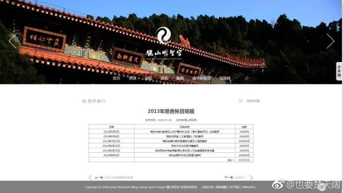 今天晚上,網友@也要楚天闊 在微博上發了兩張驪山明聖宮的慈善賬目明細,並稱:“真正的信息公開”,引發了網友的熱議。