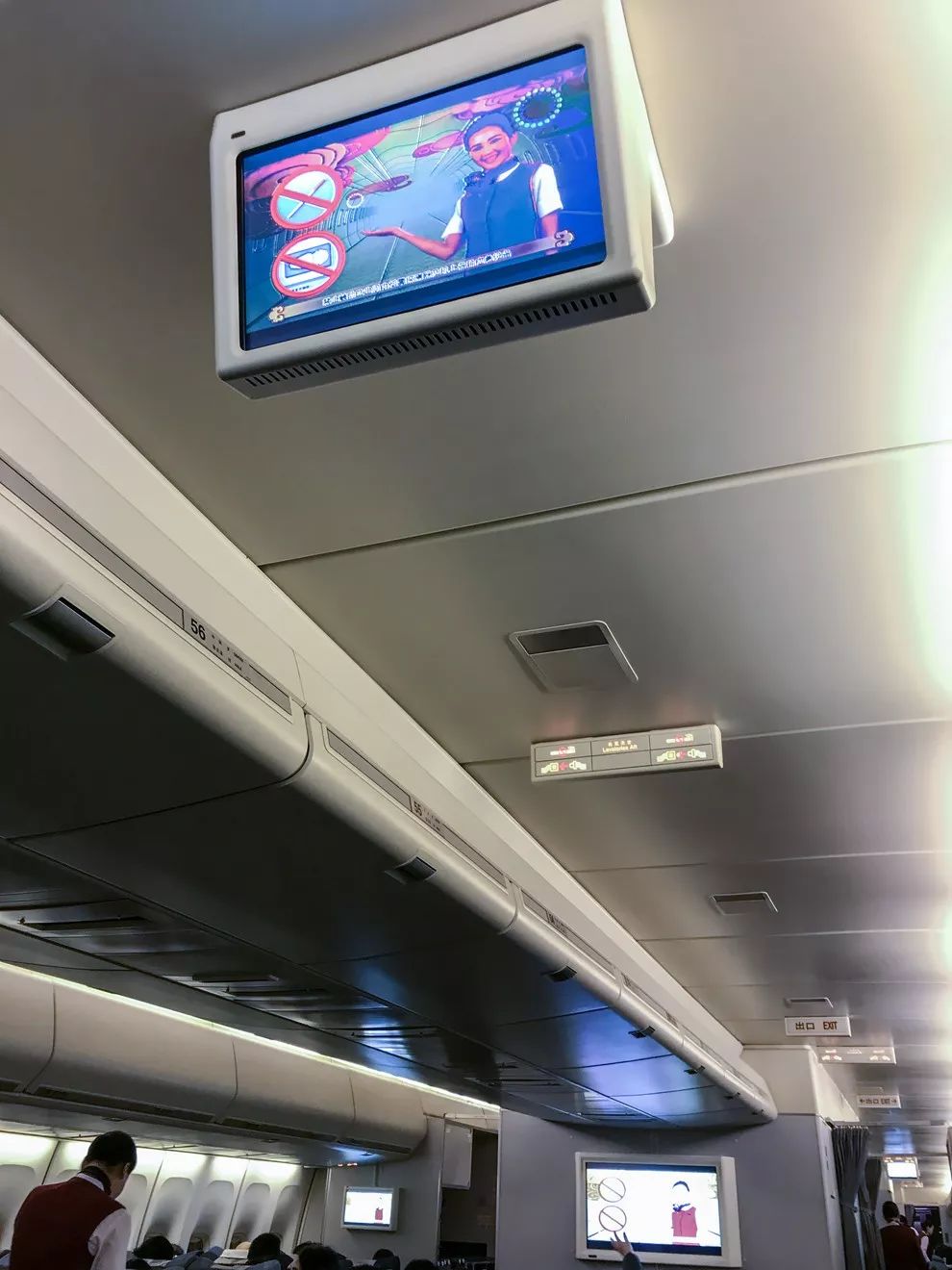 B-2447經濟艙一排10座,波音747的標準佈局。沒有個人娛樂系統,只有老式的公用顯示器。對於90年代製造的客機,這屬於標準配置,不像“2000後”飛機,滿眼的個人娛樂系統屏幕。
