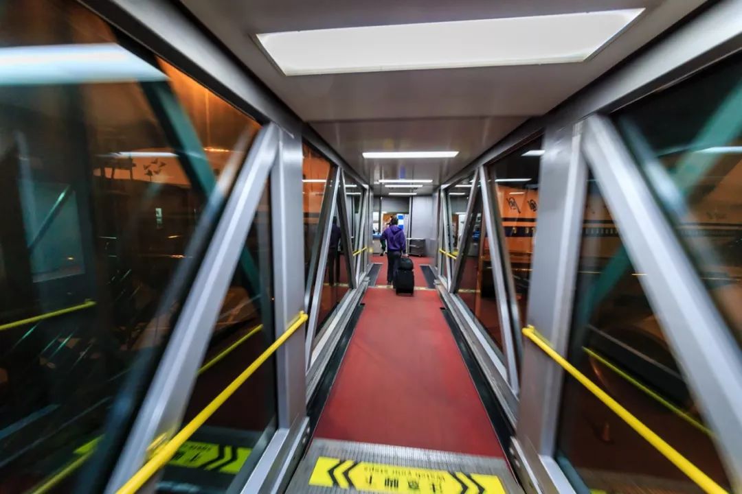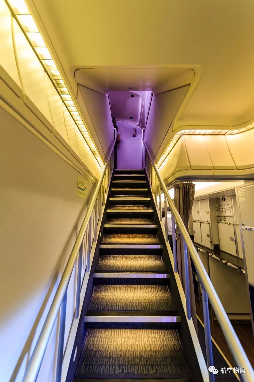 一進入飛機,就能看到通往二樓的直梯。遺憾的是,購買的經濟艙機票,沒法上樓查看商務艙~