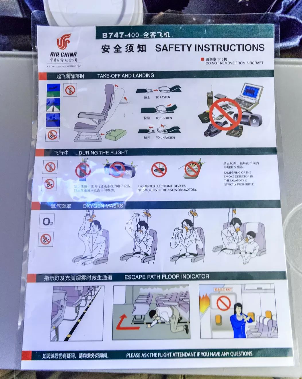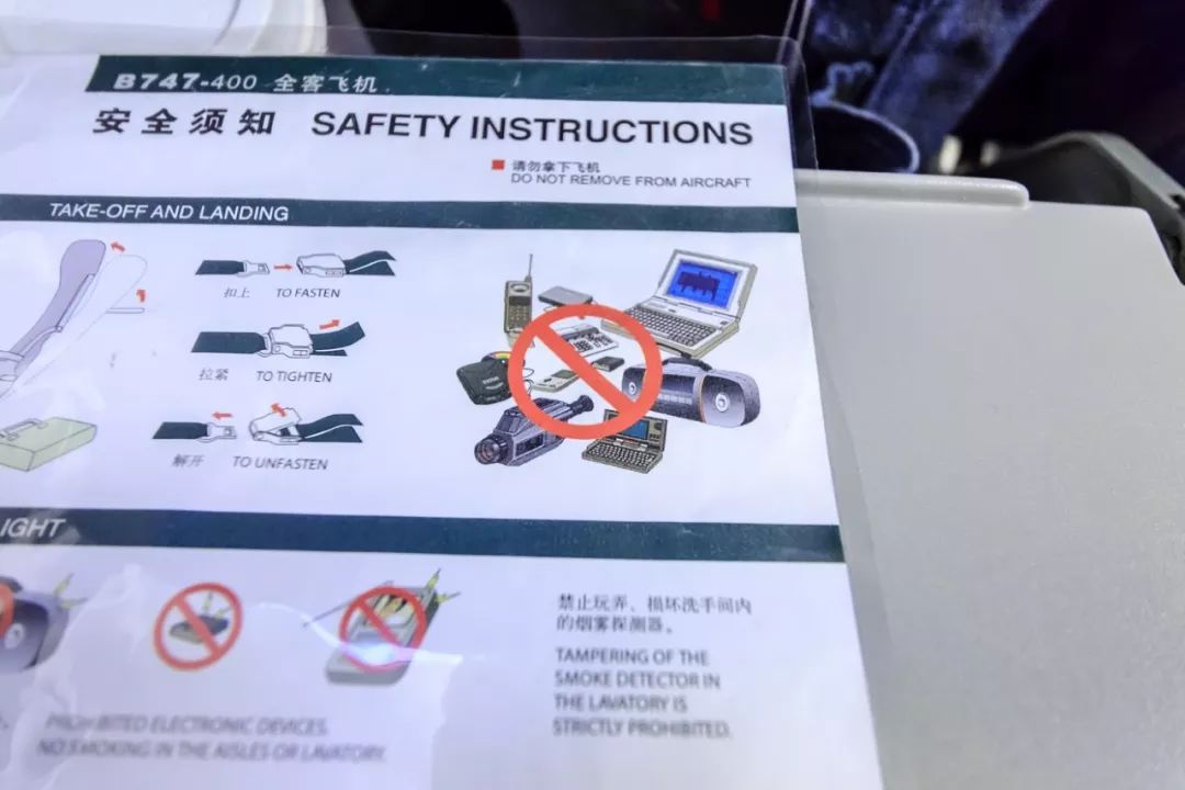 安全須知。手機(還是古董大哥大造型)依然屬於“禁用”之列,儘管實際上已經放開了。