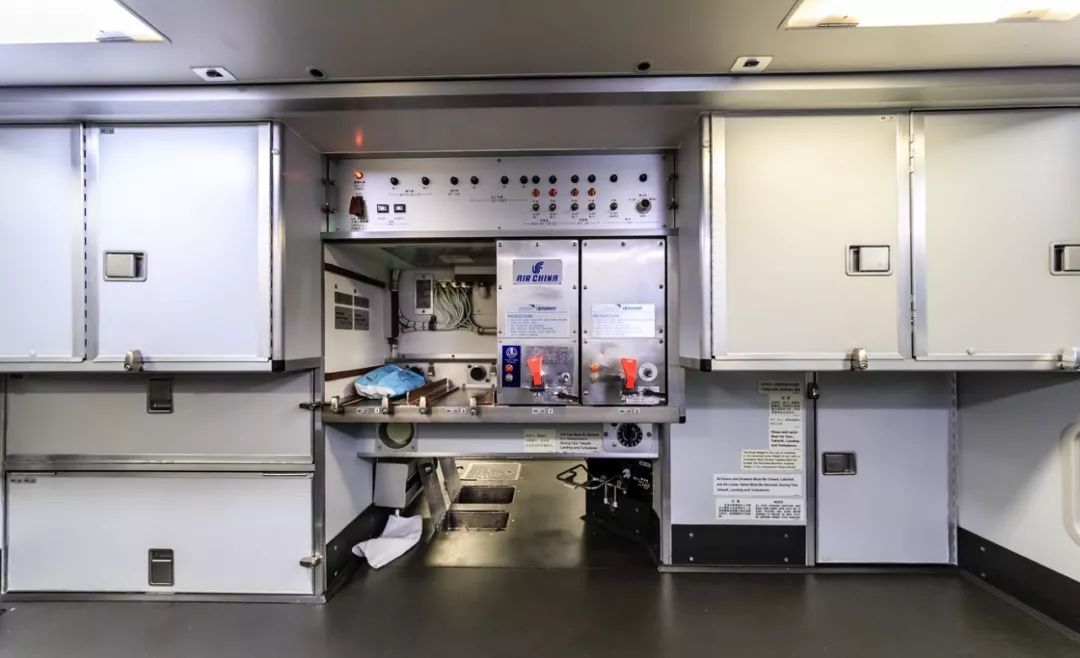 下飛機路過廚房。執行專機飛行的時候,食物也是在這裏準備的。
