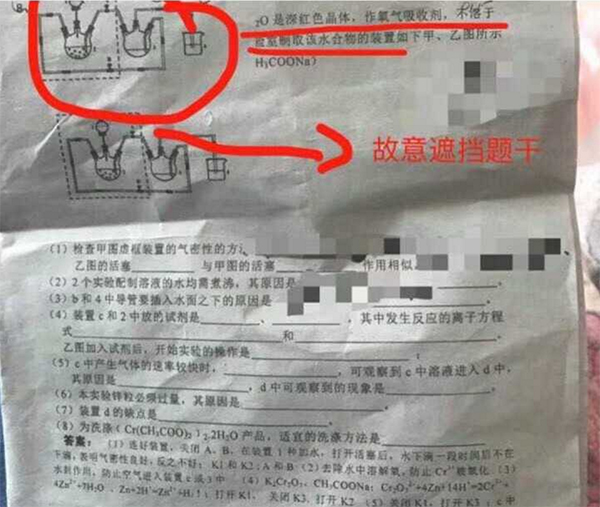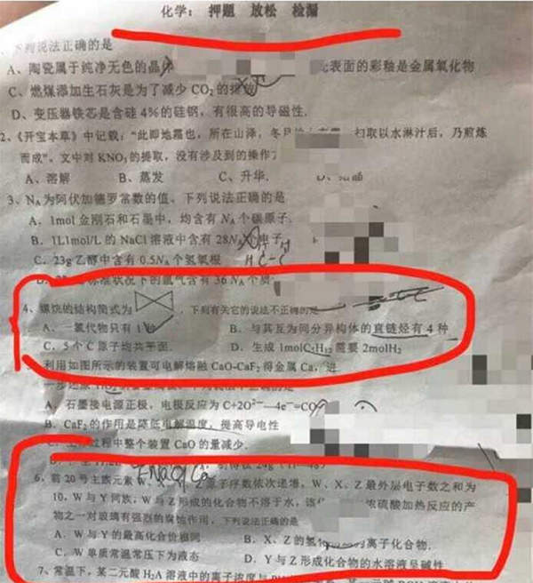 他在爆料中稱,考前一天學校曾下發一套化學押題試卷讓考生複習,高考時他發現押題試卷中有三道題與高考全國I卷理綜試卷相似。該網友貼出了押題試卷的照片,認為其中有兩道選擇題與全國I卷理綜選擇題有相似之處。