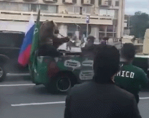 俄羅斯5:0大勝沙特後,俄球迷載着狗熊吹喇叭開進了莫斯科主幹道慶祝……