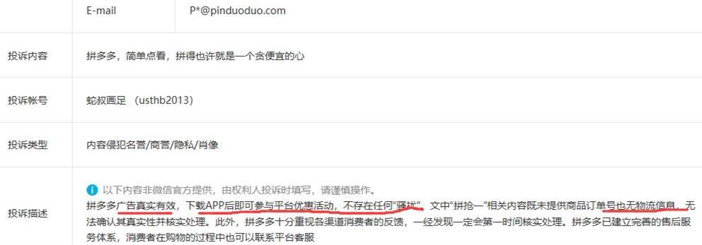 2018年3月22日,一家看上去和拼多多沒有什麼關聯的公司,對於筆者在微信公眾號發表的《拼多多,簡單點看,拼得也許就是一個貪便宜的心》進行了投訴,投訴的理由是“APP不存在騷擾,未提供商品訂單號也無物流信息”。但是,筆者在文中所引用的案例和數據都是來自第三方公益維權投訴平台,而那裏面的投訴,只要公開的,都是經過實名制核實的。因此,完全可以去對那些信息進行核實。