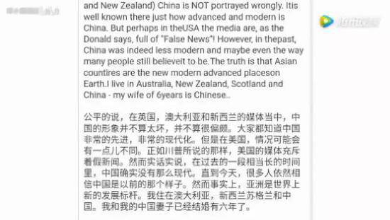 公平地説,在英國,澳大利亞和新西蘭的媒體當中,中國的形象並不算太壞,並不算很偏頗。大家都知道中國非常先進,非常現代化。但是在美國,情況可能會有一點兒不同。然而實話實説,在過去的一段相當長的時間裏,中國確實沒有那麼現代。直到今天,很多人依然相信中國是以前那個樣子。然而事實上,亞洲是世界上新的發展標杆。我在澳大利亞、新西蘭、蘇格蘭和中國都住過。我和我的中國妻子已經結婚有六年了。