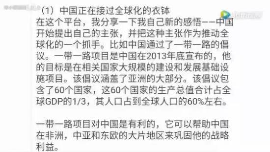 在這個平台,我分享一下我自己新的感悟——中國開始提出自己的主張,並把這種主張作為推動全球化的一個抓手。比如中國的“一帶一路”倡議。其目標是在相關國家大規模地建設和發展基礎設施項目。該倡議涵蓋了亞洲的大部分,包含全球近60個國家,這些國家的生產總值合計佔全球GDP的1/3,其人口占到全球人口的60%左右。