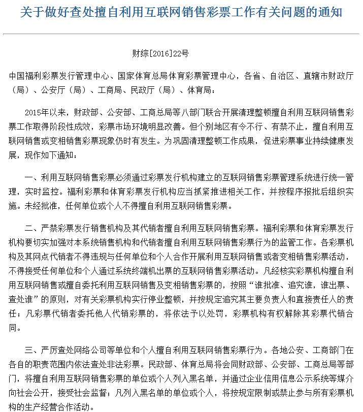 2016年,財政部再次聯合多部委發文明確要求,嚴禁彩票發行銷售機構及其代銷者擅自利用互聯網銷售彩票。財政部、民政部和國家體育總局三方明確要求互聯網彩票停售整改。