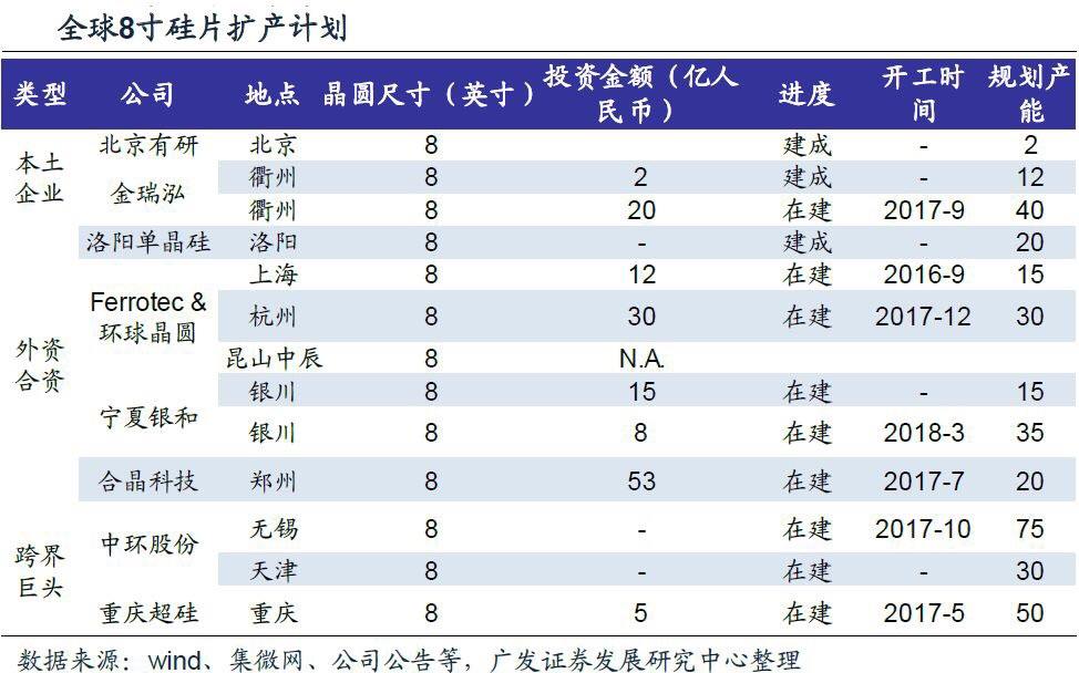 廣發證券指出,相比於12寸晶圓產線而言,8寸晶圓製造廠擁有特種晶圓工藝、完全或大部分折舊的固定資產的固定成本較低、光罩及設計服務的相應成本較低、達到成本效益生產量要求較低等方面的優勢,因此8寸晶圓和12寸晶圓能夠實現優勢互補、長期共存。根據SEMI和ICinsight的數據,2017年全球晶圓產能為17.9M/wpm(百萬8寸片/月)其中8寸片產能約為5.2M/wpm,前十大8寸晶圓廠產能佔8寸晶圓總產能的54%