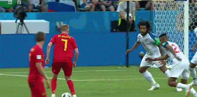 第69分鐘,阿扎爾前場左路轉身突入禁區回敲,德布勞內大禁區前沿扣過防守突入禁區右腳外腳背搓出一記弧線球,盧卡庫後點俯身頭球破門,比利時2-0巴拿馬: