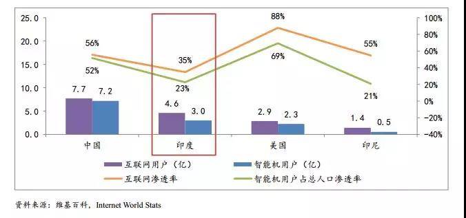 印度目前互聯網用户4.6億,互聯網滲透率為35%,低於印尼55%。印度智能手機用户為3.0億,智能機用户佔總人口滲透率為23%,稍高於印尼21%。印度和印尼均從PC時代直接跨越到移動時代,由於印度人均GDP更低,電腦普及率要遠低於印尼。