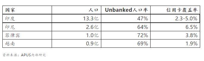 印度人口基數大,未被傳統銀行覆蓋的比例接近一半,信用卡滲透率在5%以下。對比東南亞國家,潛在需要Fintech科技擁抱的人羣基數更大。