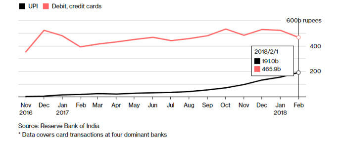2016年印度推出UPI支付後,由UPI產生的交易量便迅速上升,2018年2月的交易量已經快達到了Visa和 Mastercard的一半。隨着GoogleTez,Whatsapp等巨頭玩家的進場,和Amazon,Paytm,PhonePe,MobiKwik,Freecharge等現有玩家爭奪支付這塊蛋糕,未來支付領域線上和線下的競爭會更加白熱化。