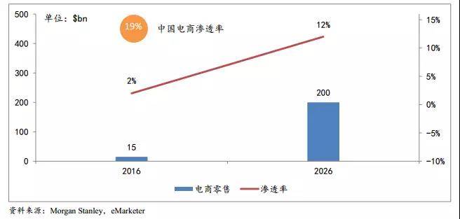 根據MorganStanley預測,2016年印度電商零售市場份額為$15bn,未來10年將以30 %的年化增長率到2026年增長到$200bn,滲透率從2%提升到12%。