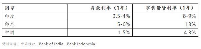 印度為高利率國家,一年期的存款基準利率為3.5-4%,一年期的貸款基準利率為8-9%。相比於印尼,印尼的一年期存款和貸款基準利率更高,分別達到5-6%和13%。