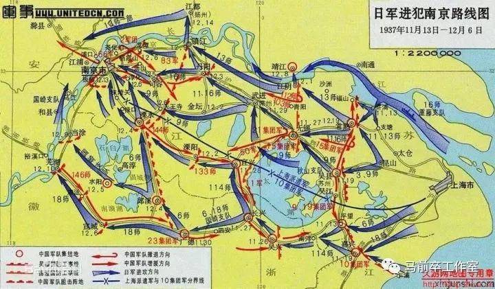 後來,德械師圍攻日本陸戰隊的戰鬥擴大為淞滬會戰,80萬國民黨軍被20萬日軍追殺到南京。看一眼戰役地圖,就知道再加100萬貌似現代化的部隊,也不太可能有什麼額外效果: