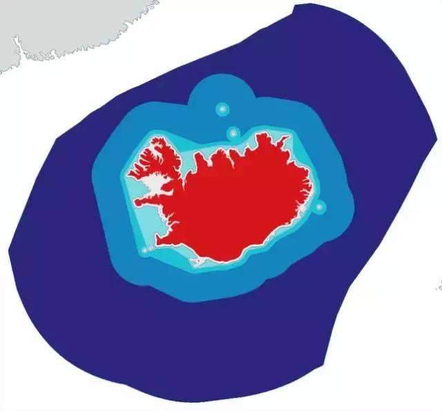 直到第3次鱈魚戰爭結束,冰島不斷擴大自己主張的漁業限定區範圍。圖中紅色為冰島國土,四種藍色由內至外,分別是4、12、50、200海里漁業限制區。圖片:Kjallakr / wikimedia