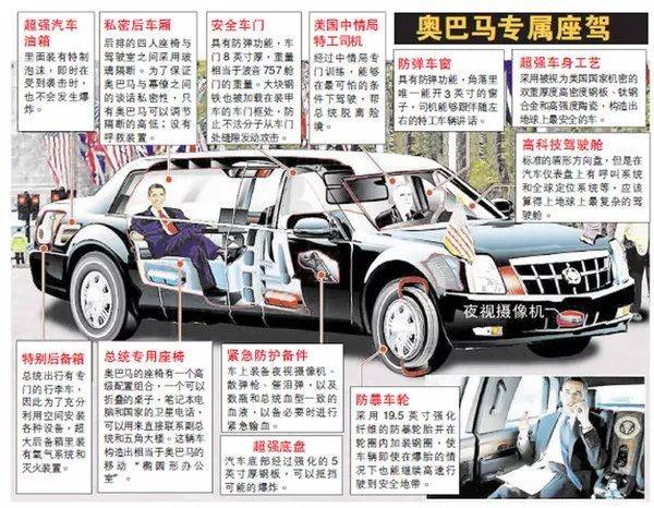 例如美國總統的專車“野獸”,除了基本的防護裝置外,該車還配備了可以在緊急情況下同外部通聯的通訊設備,以保證總統在任何情況下都可以對美國上下發布命令。