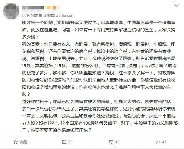 剛才答一個問題,我知道答案無法過沈(審——不好意思實在忍不住把錯別字標出來,下同),但真地(的)想説,中國軍迷真是一個傻逼富礦。就放在這裏吧。問題:如果有一個專門支持國家建造航母的基金,大家會捐多少錢?