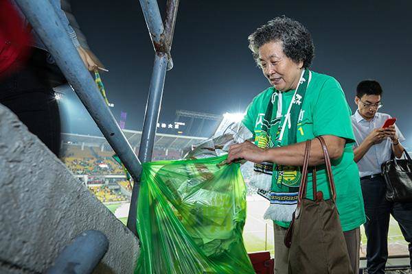 球迷“九奶奶” 在國安隊比賽後收拾垃圾。