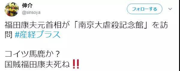 類似的還有這位叫做鈴木傾城,他充滿陰謀論地寫道:“福田康夫前首相訪問南京大屠殺遇難者紀念館。説了‘日本人應該訪問紀念館,瞭解歷史’,但是南京大屠殺是中國捏造的。被中國哄騙的福田康夫怎麼做呢,被利用宣傳、使用為賣國政治家正是中國骯髒的手段。”