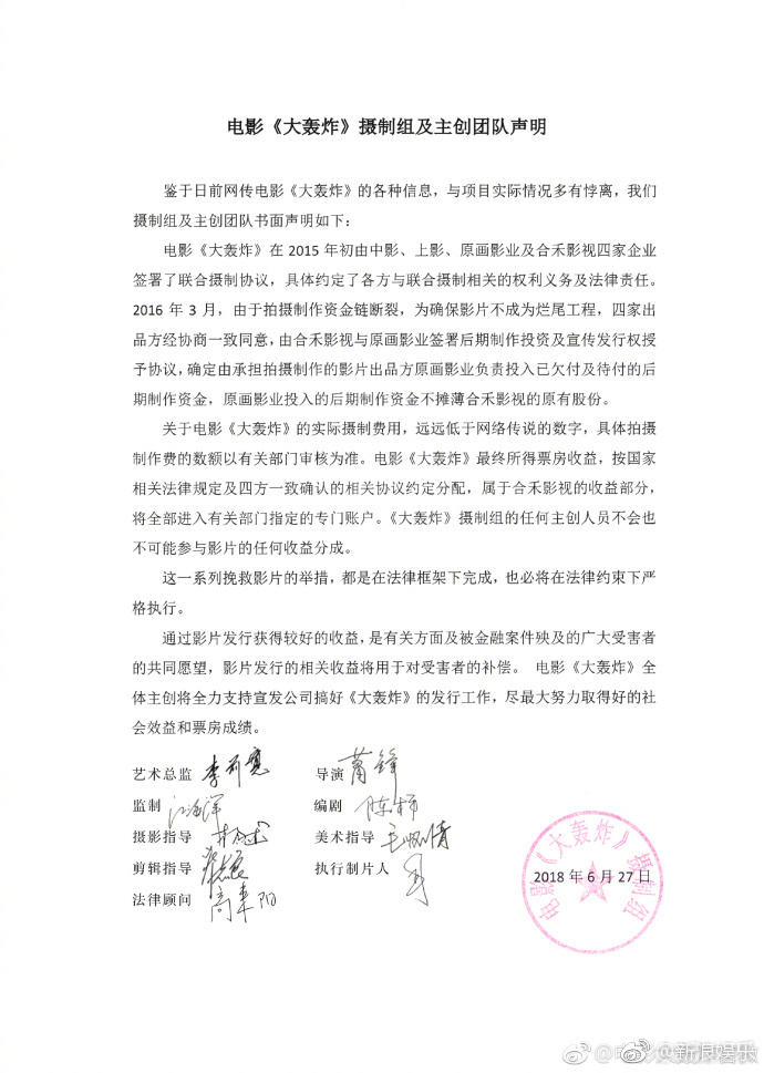 據監製江海洋透露,“16年3月,該片原投資方合禾影視資金鍊斷裂,有關部門對其展開調查,公司名存實亡。後來合禾影視和原畫影業簽署協議,由原畫影業負責投入已欠付和待付的後期資金。”主創還表示,“《大轟炸》的上映,是被金融案件殃及的廣大受害者的共同願望,我們希望通過對影片的發行爭取獲得比較好的收益,用於對受害者的補償。”該片書面聲明還表示,“攝製組的任何主創人員不會也不可能參與影片的任何收益分成。”