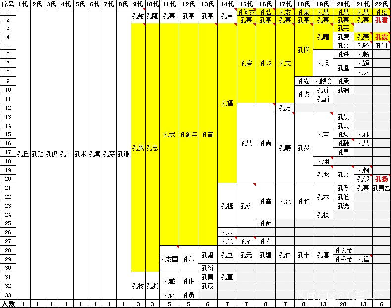 注:上圖標綠色代表科舉中進士者,共40人,40代文宣公孔振為唐懿宗時進士。