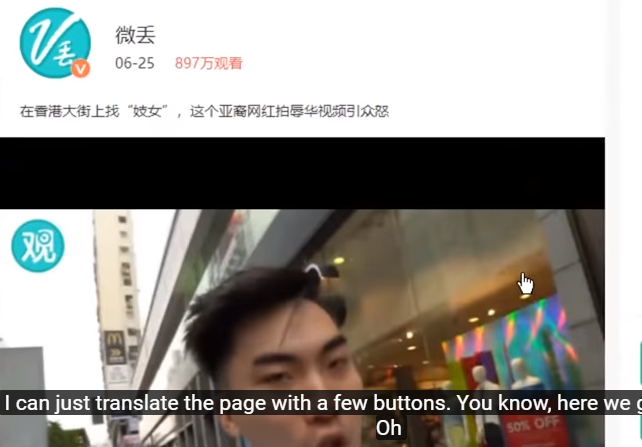 在上支視頻中,他和同伴一邊感嘆“英語這麼流行”,一邊嘲笑香港路人不懂英語,“我説什麼來着,他們聽不懂。”