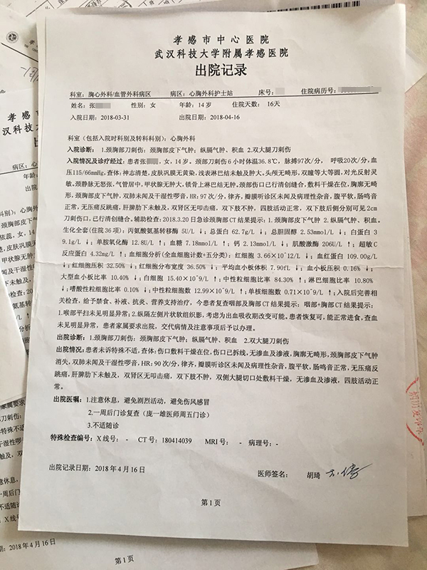 張某的出院記錄顯示,她入院診斷時頸胸部刀刺傷,頸胸部皮下氣腫;縱膈氣腫、積血。雙大腿刀刺傷。母親鄧小莉稱,看到女兒參差不齊的傷口和擔心孩子出事,她當晚一直守着孩子不敢走。