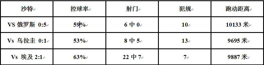總結:沙特隊3戰2負1勝,拿到3分。比賽中的控球率總是高於對方,但他們是5只球隊中唯一一個貢獻過“慘案”的球隊。不過第三場對埃及幾乎碾壓對手。