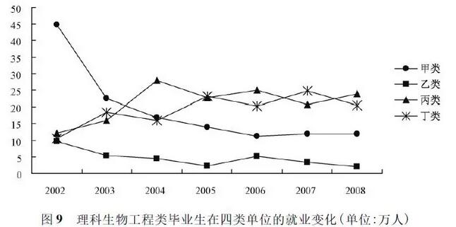 這一強烈反差還可以通過就業學生的實際去向觀察。在過去幾年中,就業學生畢業時成功尋得工作的去向,有兩個明顯趨勢:一是就業單位類別逐漸向基層轉移;二是就業城市逐漸向非中心城市轉移。根據教育部高校學生司所編的《升學與就業:高考填報志願指南》歷年期分冊,文科“法學”類學位畢業生2002-2008年在四類單位的就業趨勢情況如下: