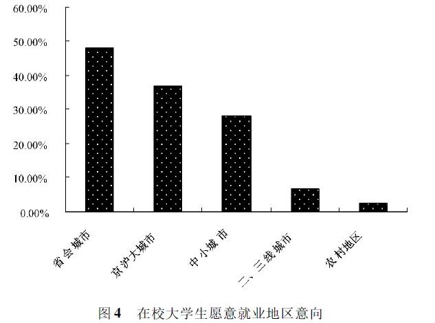 同樣的調查顯示,受訪學生對“最願意去的就業地區”選擇結果為:省會城市(47.9%),北京、上海等大城市(36.9%),中小城市(27.9%),發展速度快且地理區位重要的二、三線城市(6.6%),農村地區 (2.5%)。