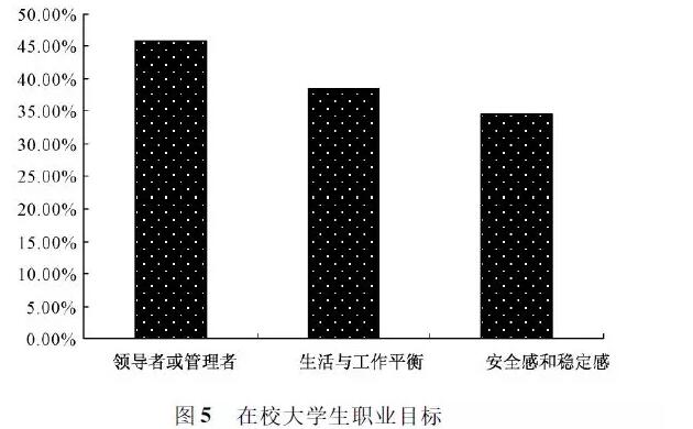 受訪學生對“大學生職業目標”的選擇排序是:領導者或管理者(45.9%),生活與工作平衡(38.5%),安全感和穩定感(34.5%)。 多數學生最願意進入的是管理性機構和崗位,與近年公務員報考人數大增可以相互印證。調查問及“公務員職業吸引大學生的緣由”,學生回答的排序是:福利好( 66.5%);穩定性好(66.3%);保障好。