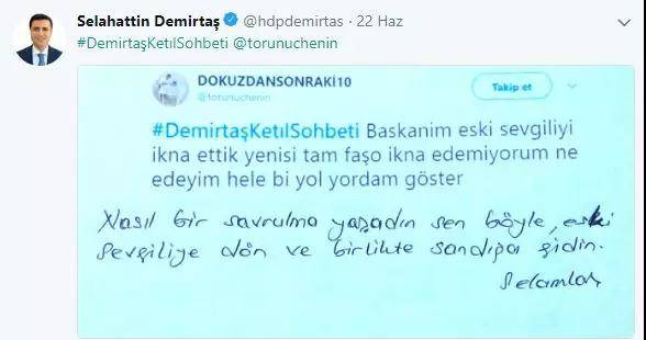 粉絲推文:主席,我説服了我的前女友(給我們投票),但我的現女友是法西斯,再怎麼樣都説服不了她,我該怎麼辦,您給指條路吧。(此推文背景為2014年選舉時,德米爾塔什呼籲選民説服身邊的每一個人,甚至包括前女友)