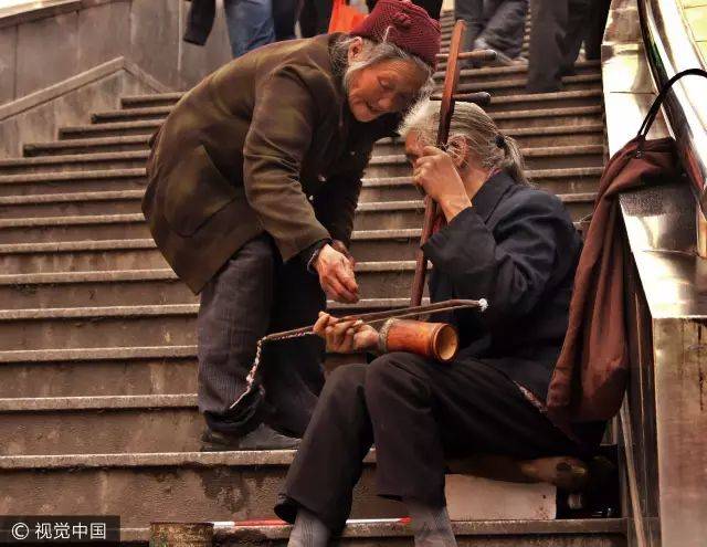 2012年3月19日,貴州貴陽,一位撿垃圾的老太給一位拉二胡的盲老太捐錢 / 視覺中國