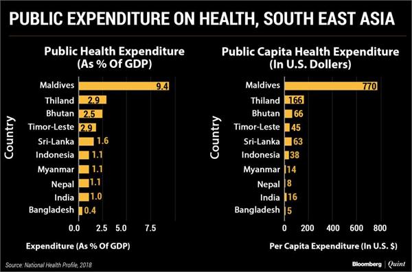 上個月,彭博社曾報道,印度每年在公共衞生方面的人均支出約1112盧比(合16美元),相當於大多數飯店裏一份披薩的費用。報道指出,印度的公共衞生支出在世界上是最低的,佔其國內生產總值(GDP)的1.02%,且自2009年以來在九年內幾乎保持不變。
